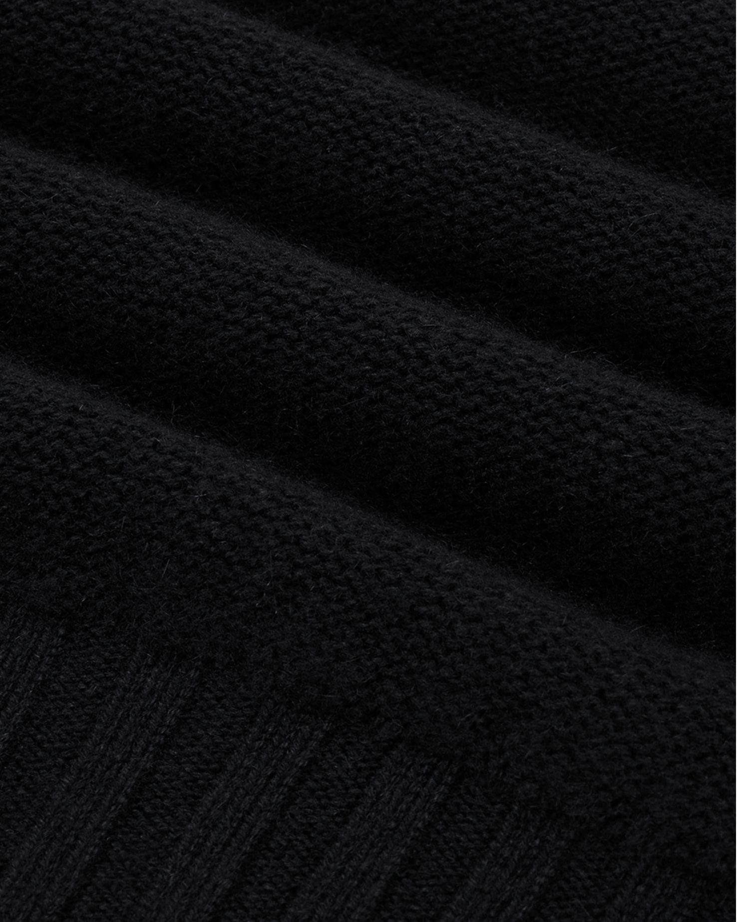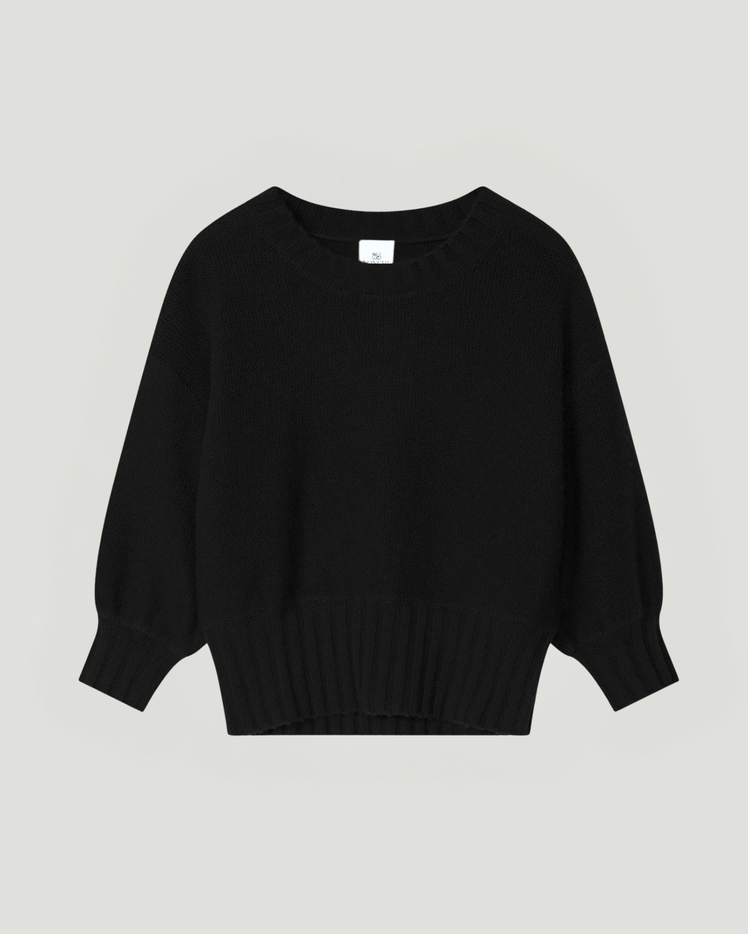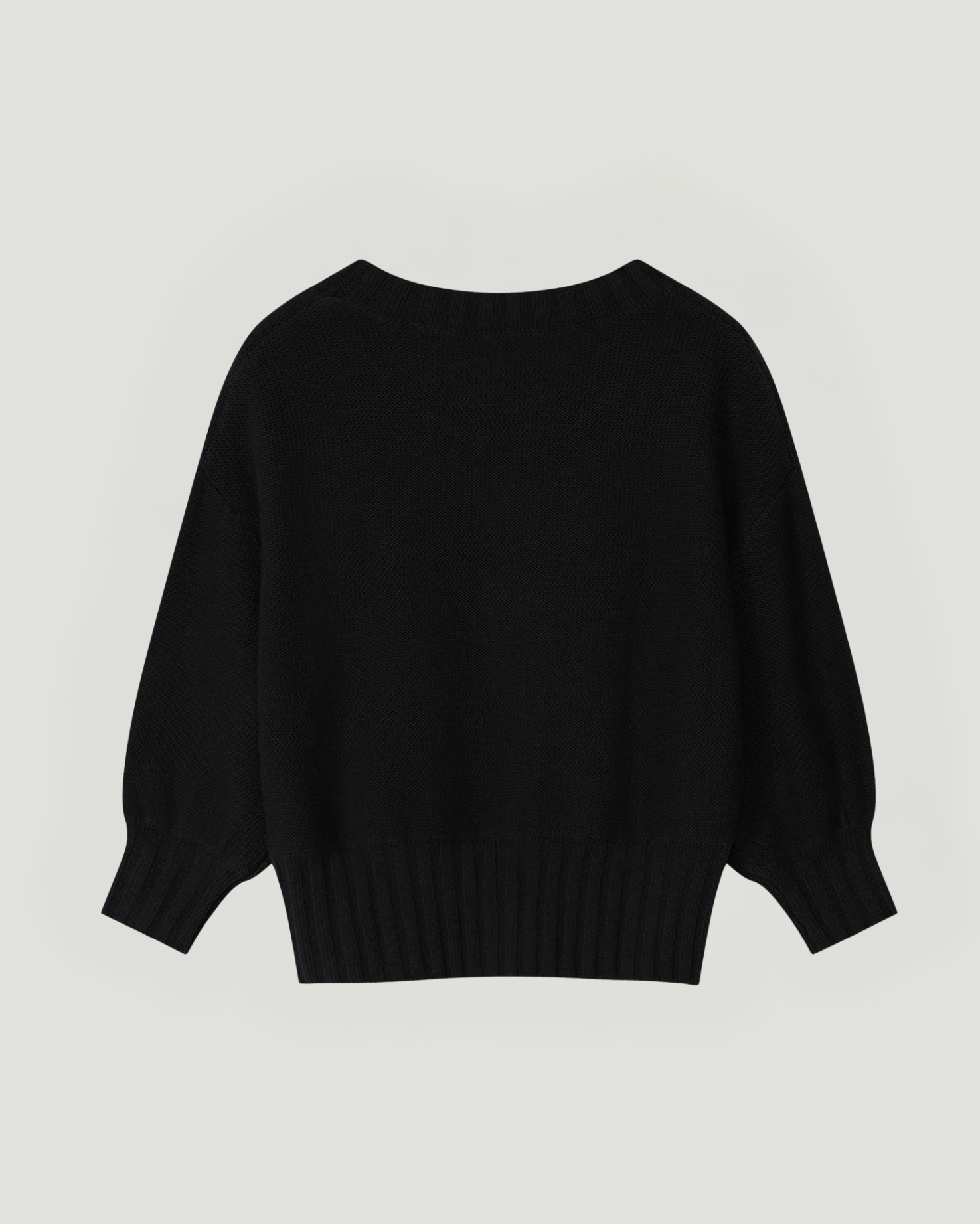 Alva, named for its northern meaning, elf, carries a sense of quiet lightness and softness. Knitted in Black cashmere, with slim sleeves that fall just above the wrist and a gently shaped collar.
