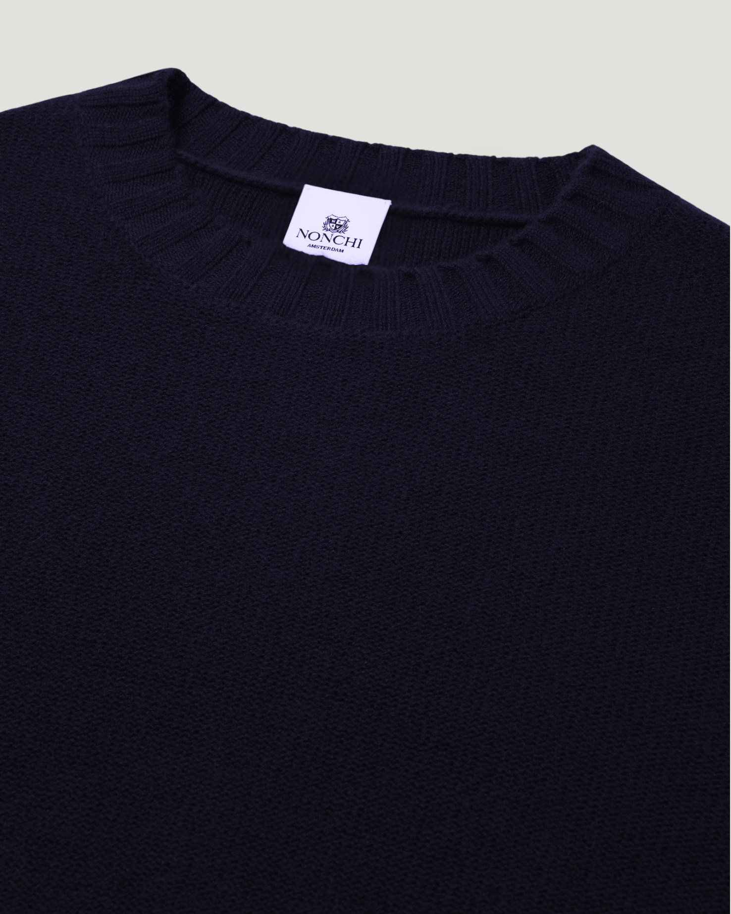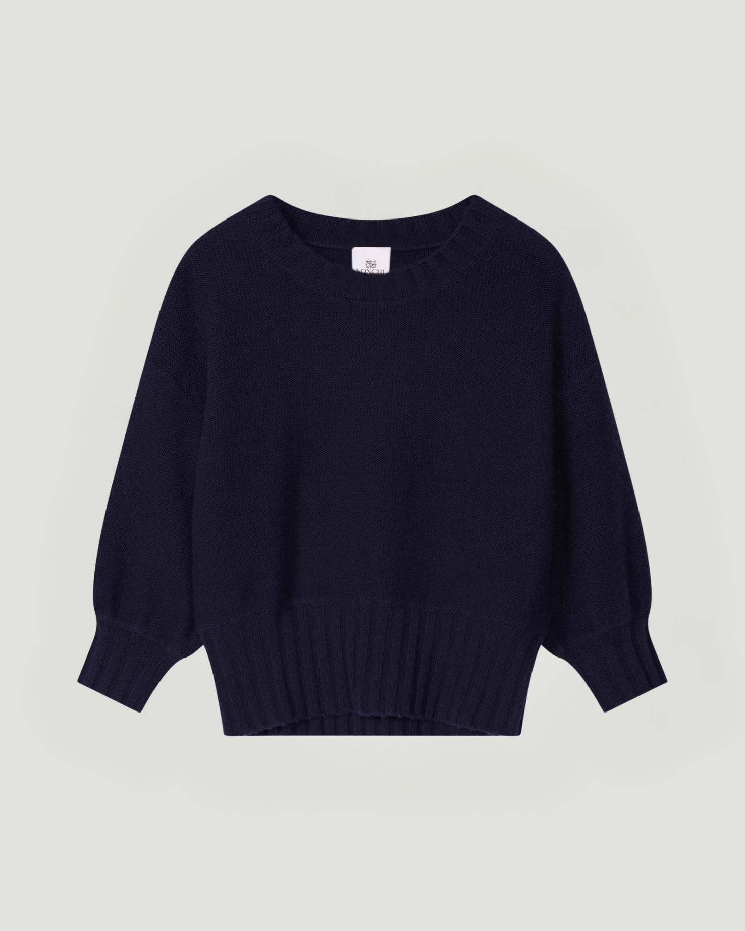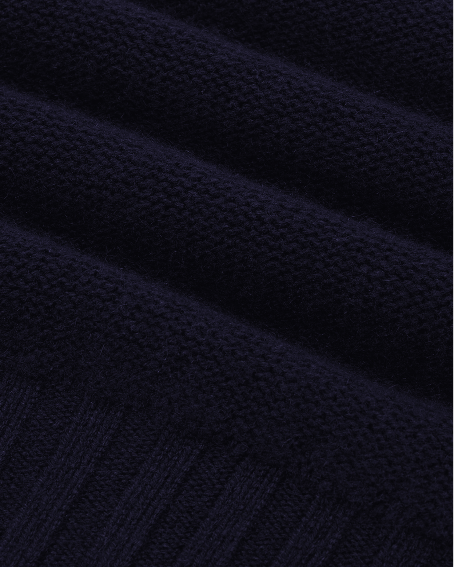 Alva, named for its northern meaning, elf, carries a sense of quiet lightness and softness. Knitted in Navy cashmere, with slim sleeves that fall just above the wrist and a gently shaped collar.